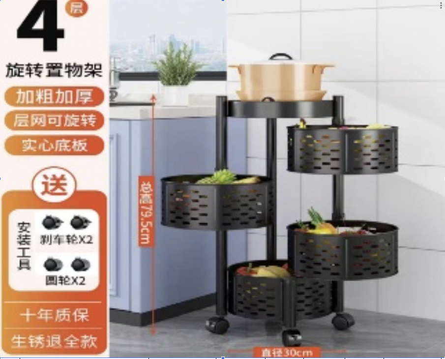 Étagère Ronde Rotative 4 Niveaux – Métal Noir ou Blanc – Panier de Rangement à Roulettes