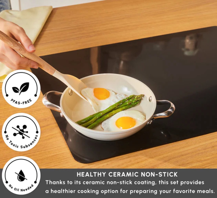 Avec son revêtement antiadhésif de haute qualité et sa couleur crème raffinée, elle permet une cuisson homogène sans accrocher, tout en apportant une touche moderne à votre cuisine.
